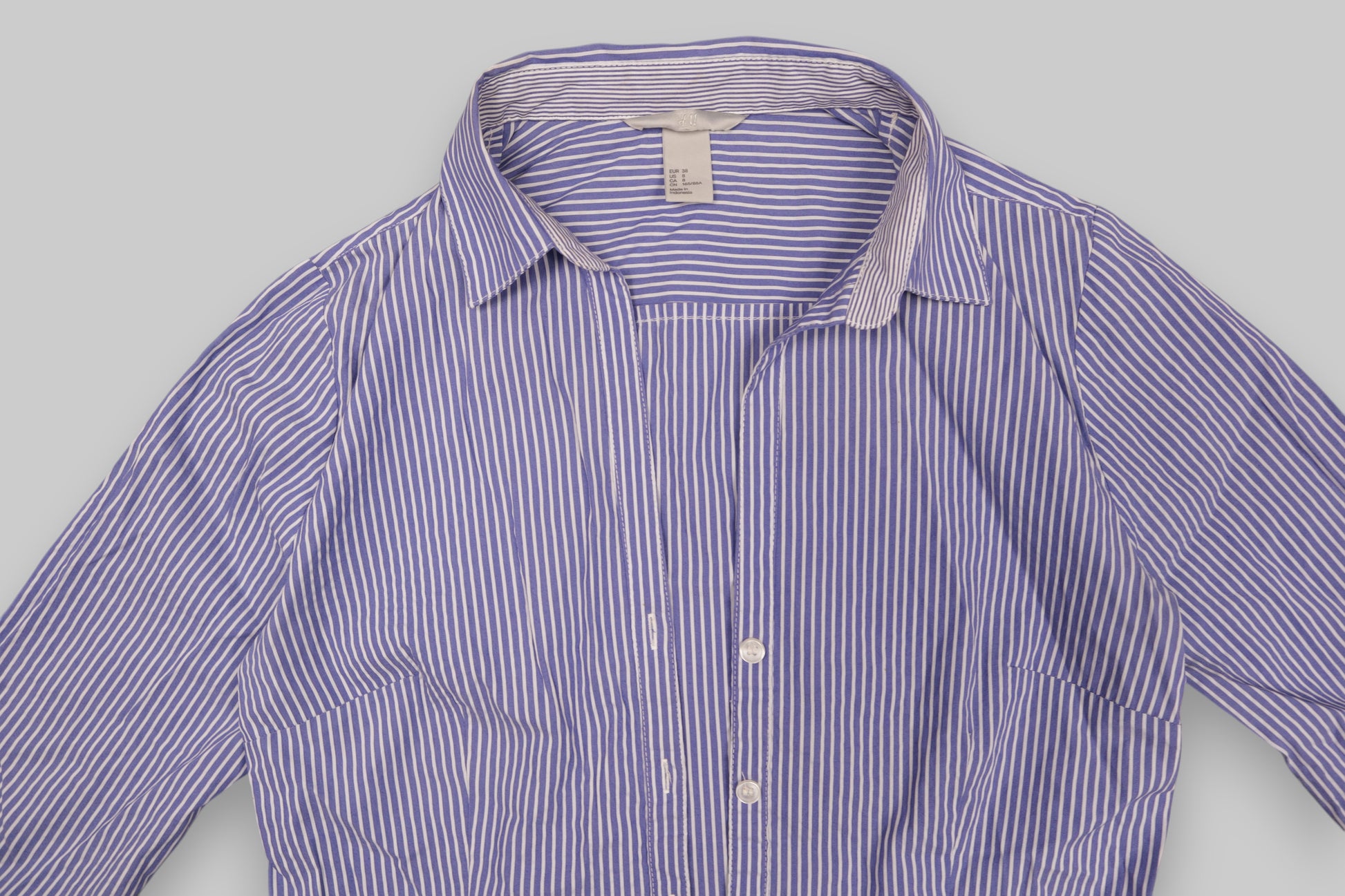 Color/Pattern: Blue with white vertical stripes; contrasting horizontal stripe on inner collar and placket