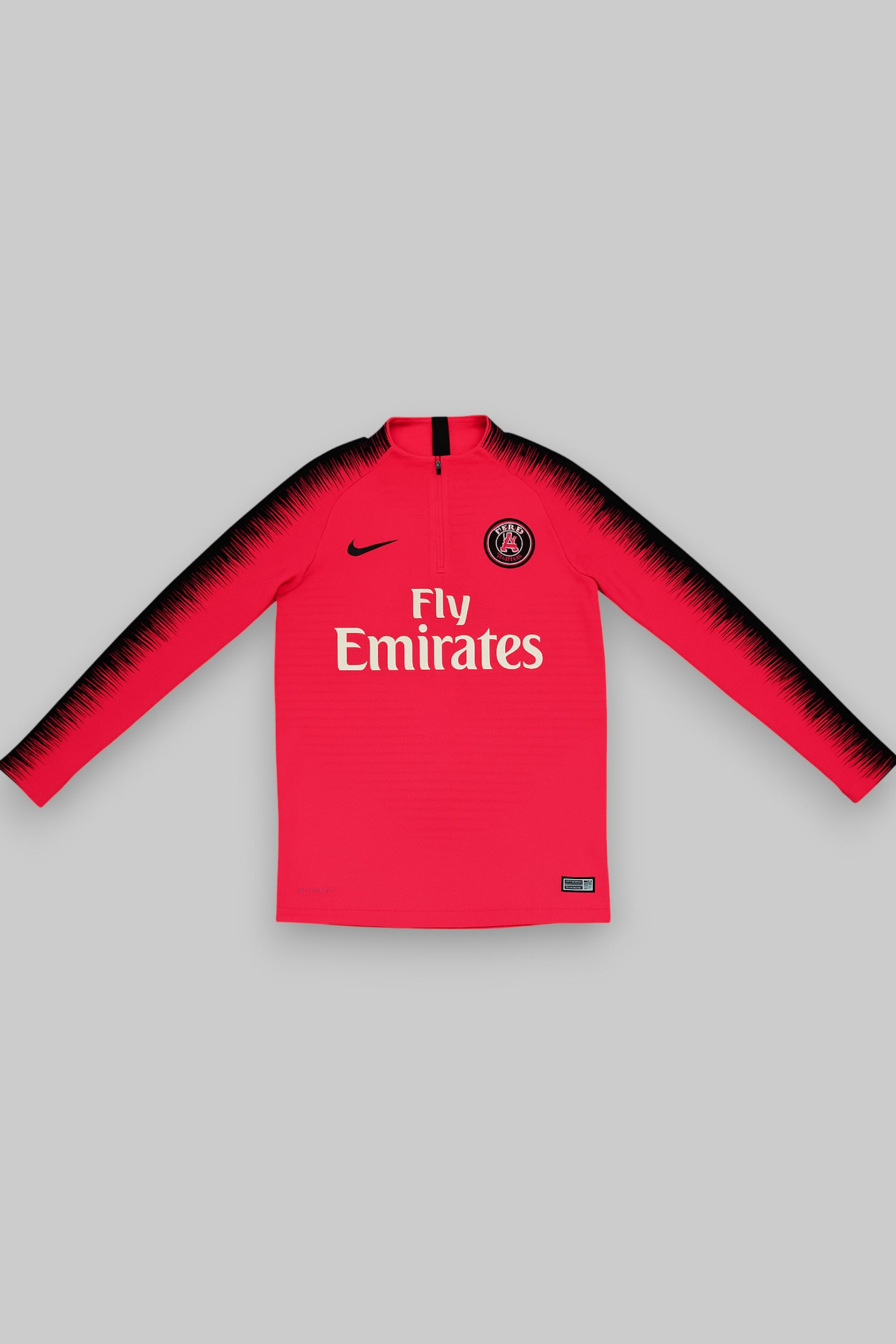 Design Features: Quarter-zip collar, Dri-FIT fabric, mesh ventilation zones, Fly Emirates logo, PSG crest, Nike Swoosh logo