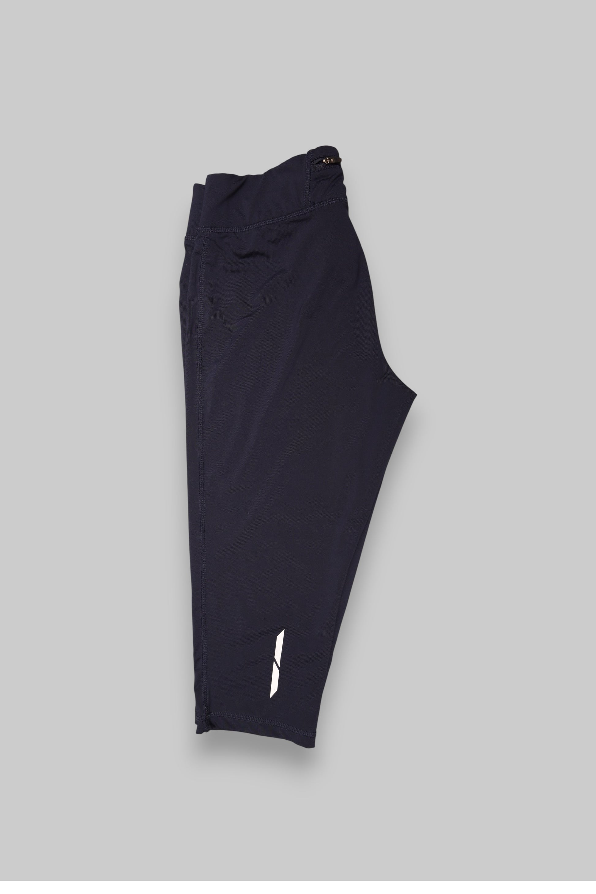 These Crivit women’s 3/4 length performance tights are shown from the back, highlighting their supportive and functional design. Made from a smooth stretch-performance knit, they feature a wide waistband that provides excellent core support and comfort. The subtle contour stitching enhances shape and flexibility, while reflective double-chevron accents on the lower back of each leg improve visibility in low light. A small hidden zip pocket at the center back waistband offers convenient storage for small essentials.