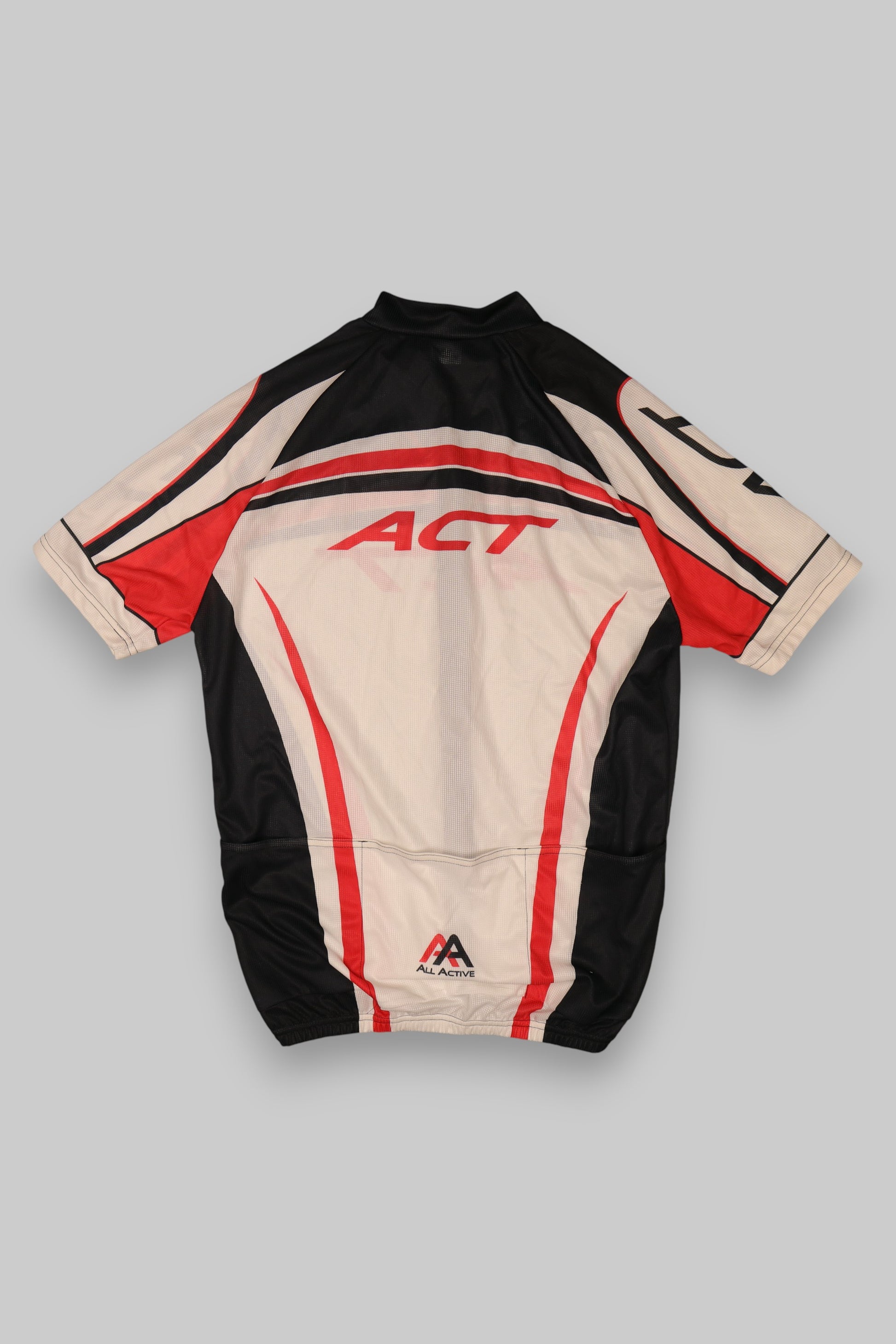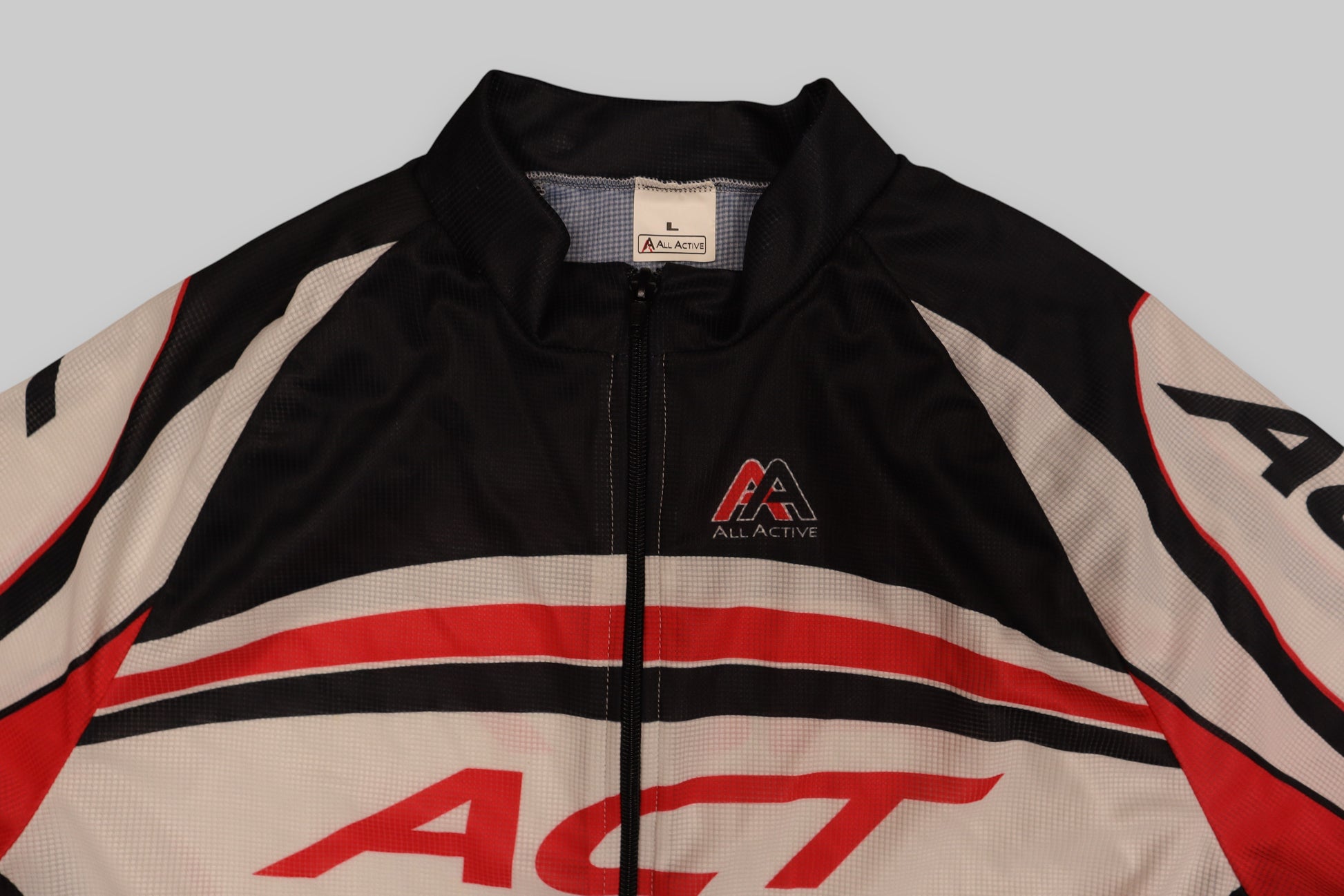 Design Features: Full-length zipper, aerodynamic short sleeves, bold red “ACT” print on chest and sleeves, red and black graphic lines, honeycomb-textured fabric, high collar