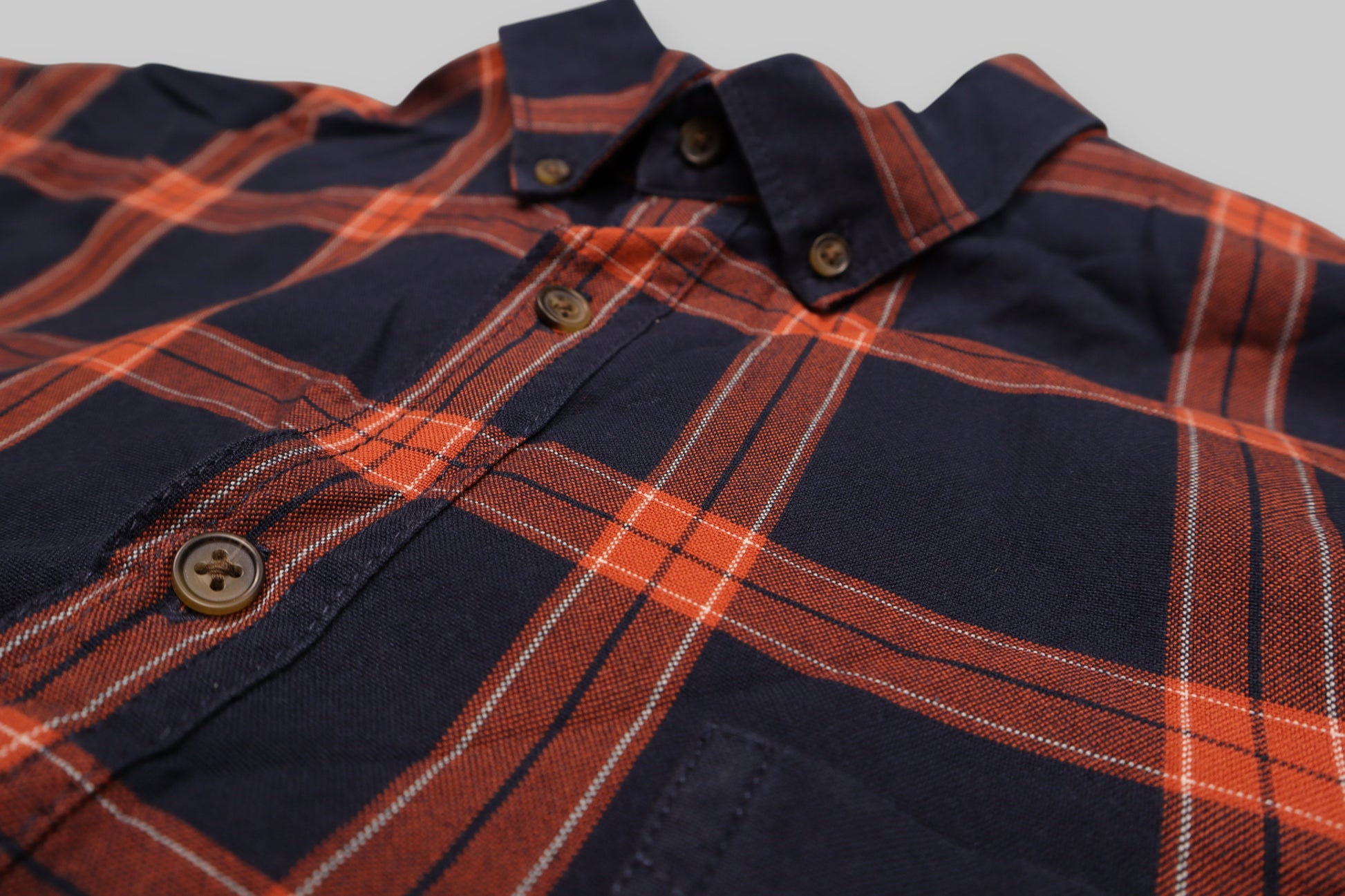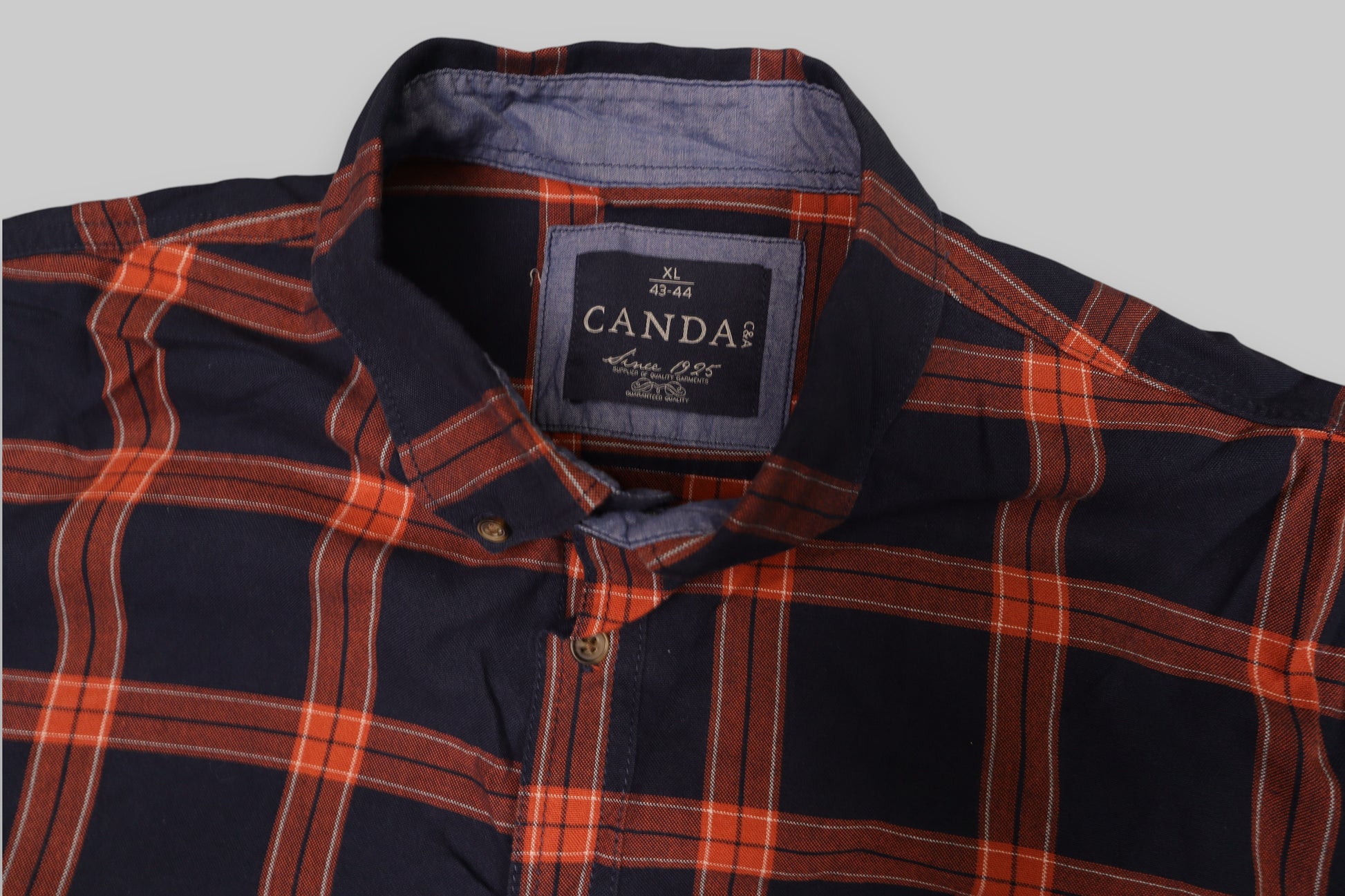 This CANDA Adventure Explorer flannel shirt offers a perfect blend of warmth, comfort, and rugged style. Crafted from 100% cotton, it features a navy blue base with a burnt orange and white plaid pattern, ideal for layering in cooler weather. The button-down collar with chambray contrast lining, brown tonal buttons, and Adventure Explorer label detail add refined, casual character to this everyday essential.