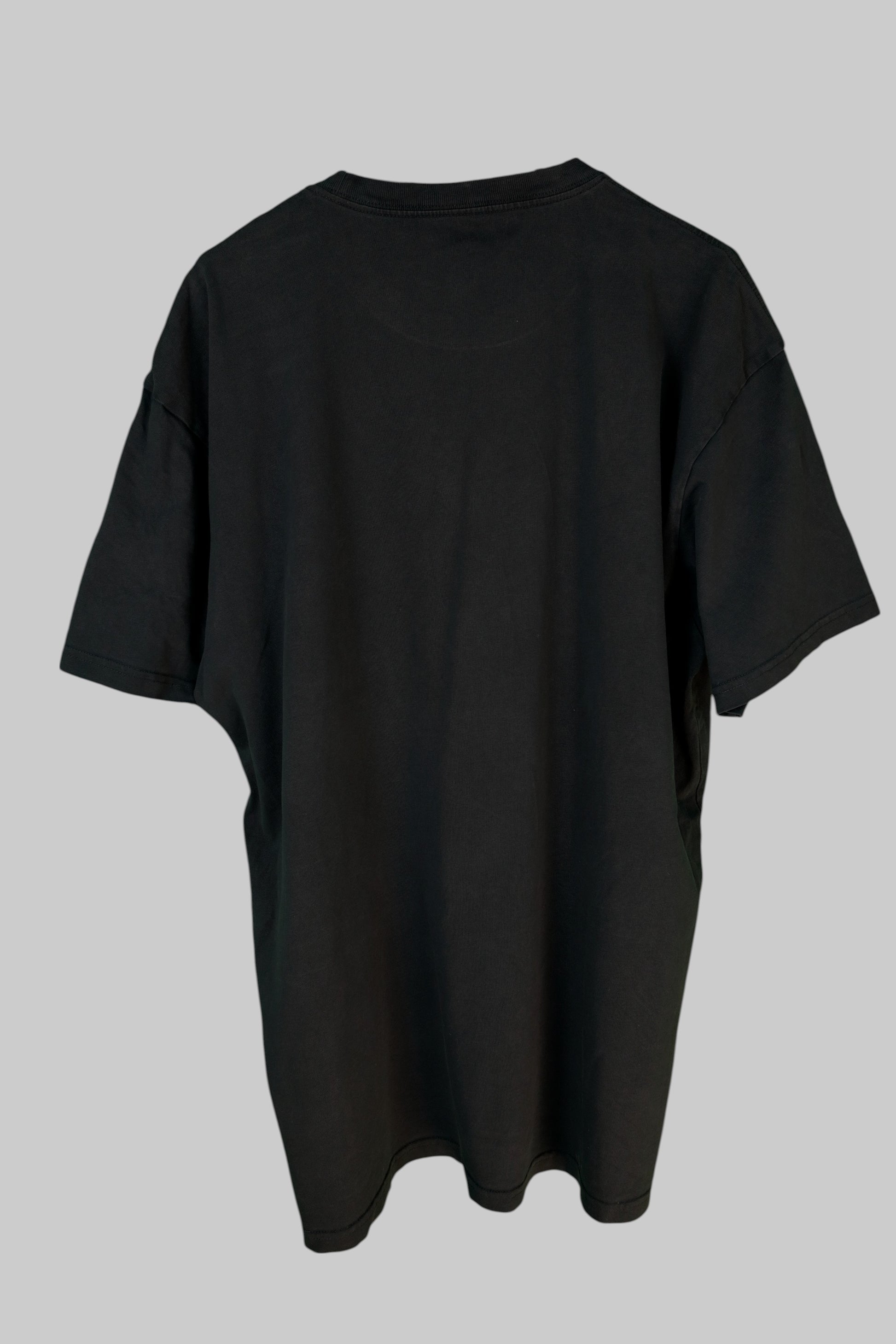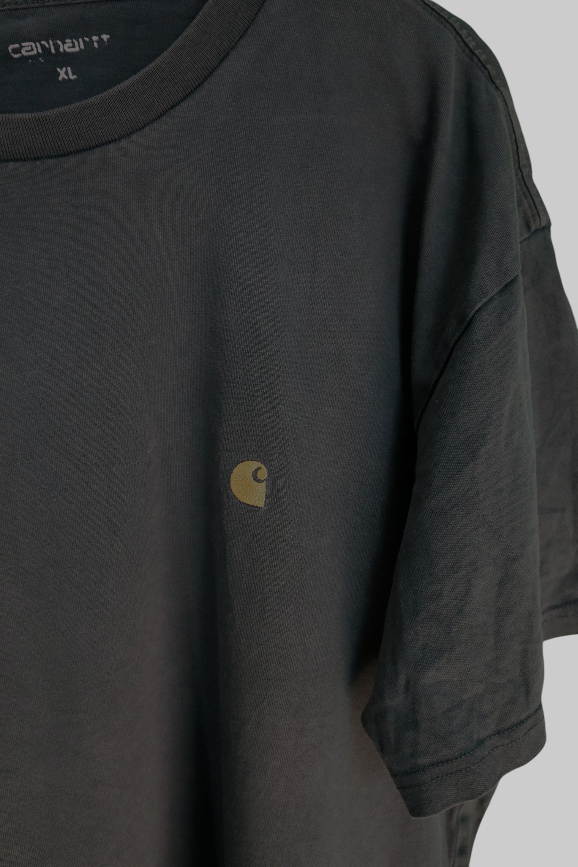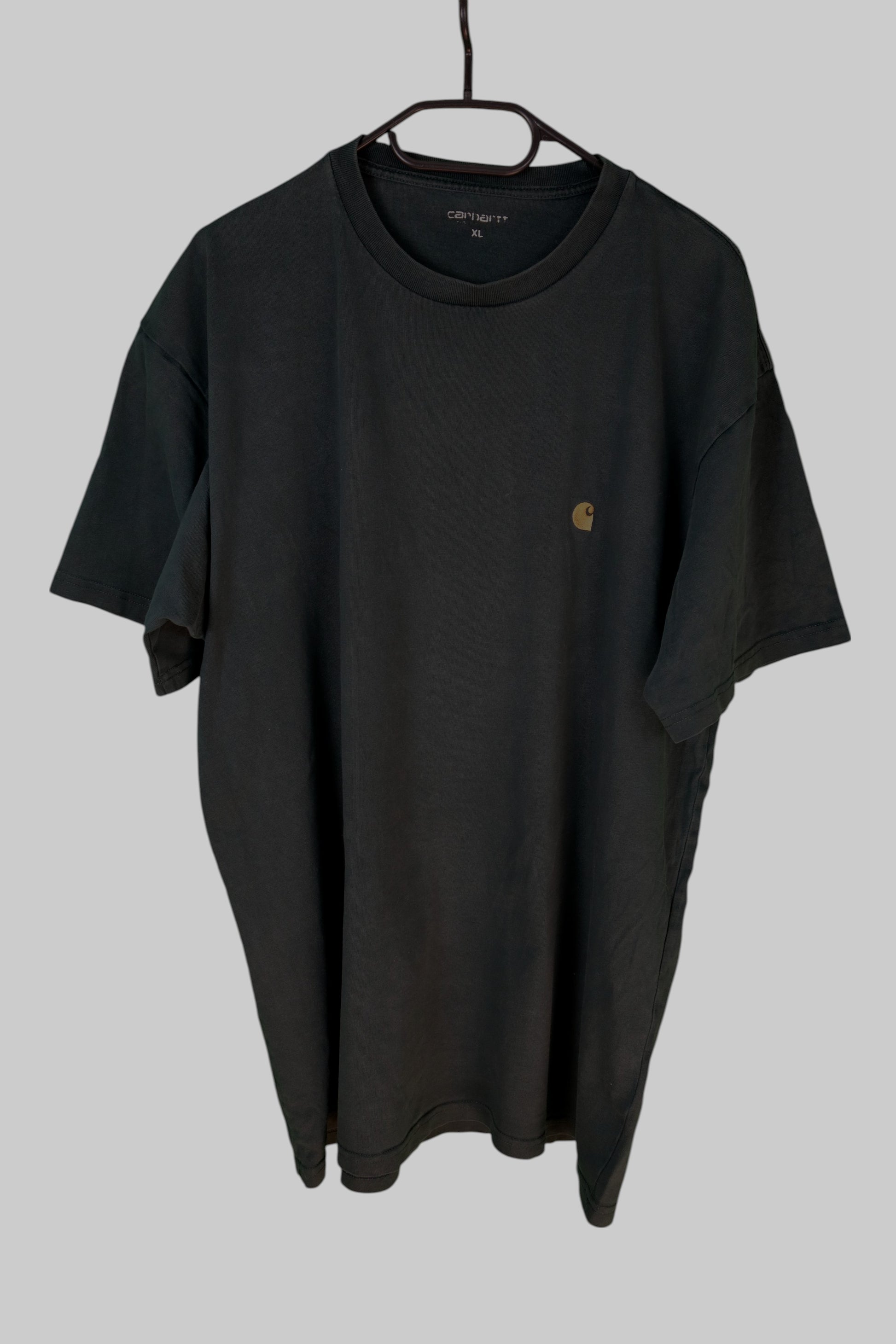 Minimalist Style: Solid washed black color with a small, embroidered Carhartt “C” logo on the left chest in a muted golden brown