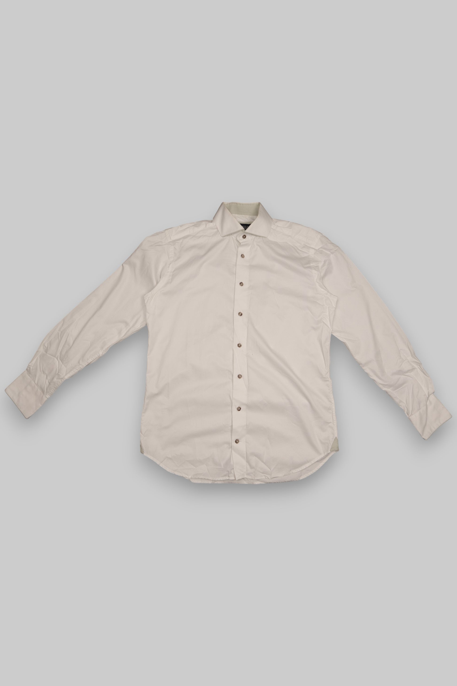 This Cavallaro Napoli Doppio Ritorto dress shirt embodies refined Italian craftsmanship and understated elegance. Made from 100% cotton, it features a double-twisted yarn weave for a smooth, durable, and luxuriously soft finish. The off-white hue pairs effortlessly with formal or business attire, while the light sage inner collar lining and brown horn-style buttons add subtle sophistication.