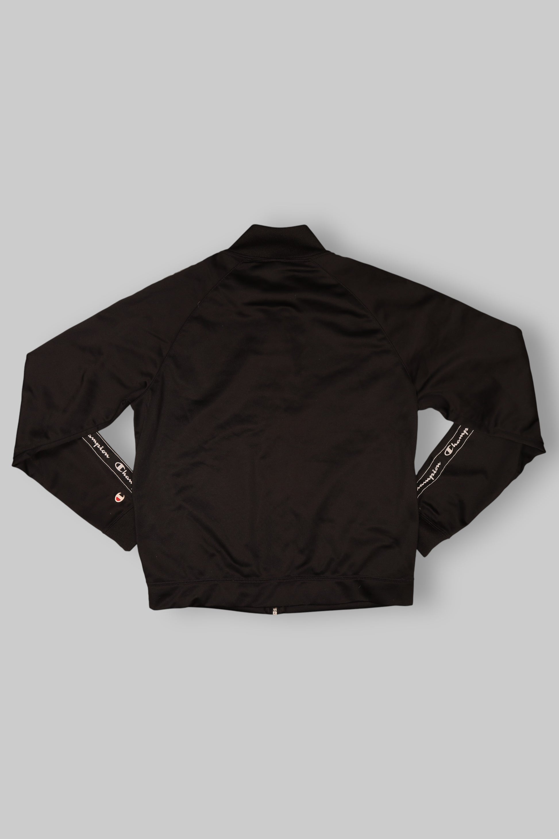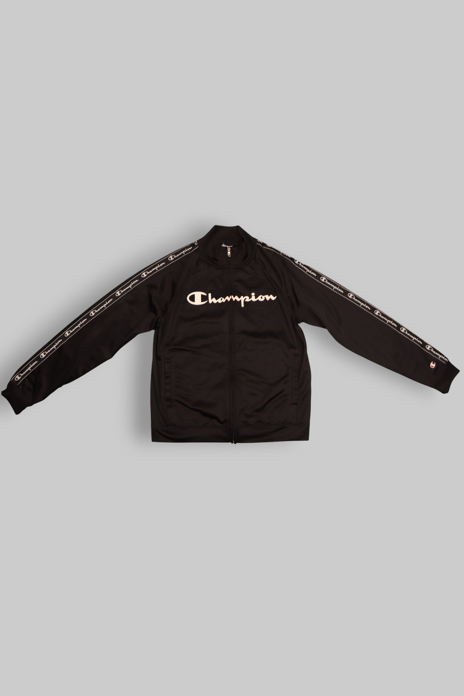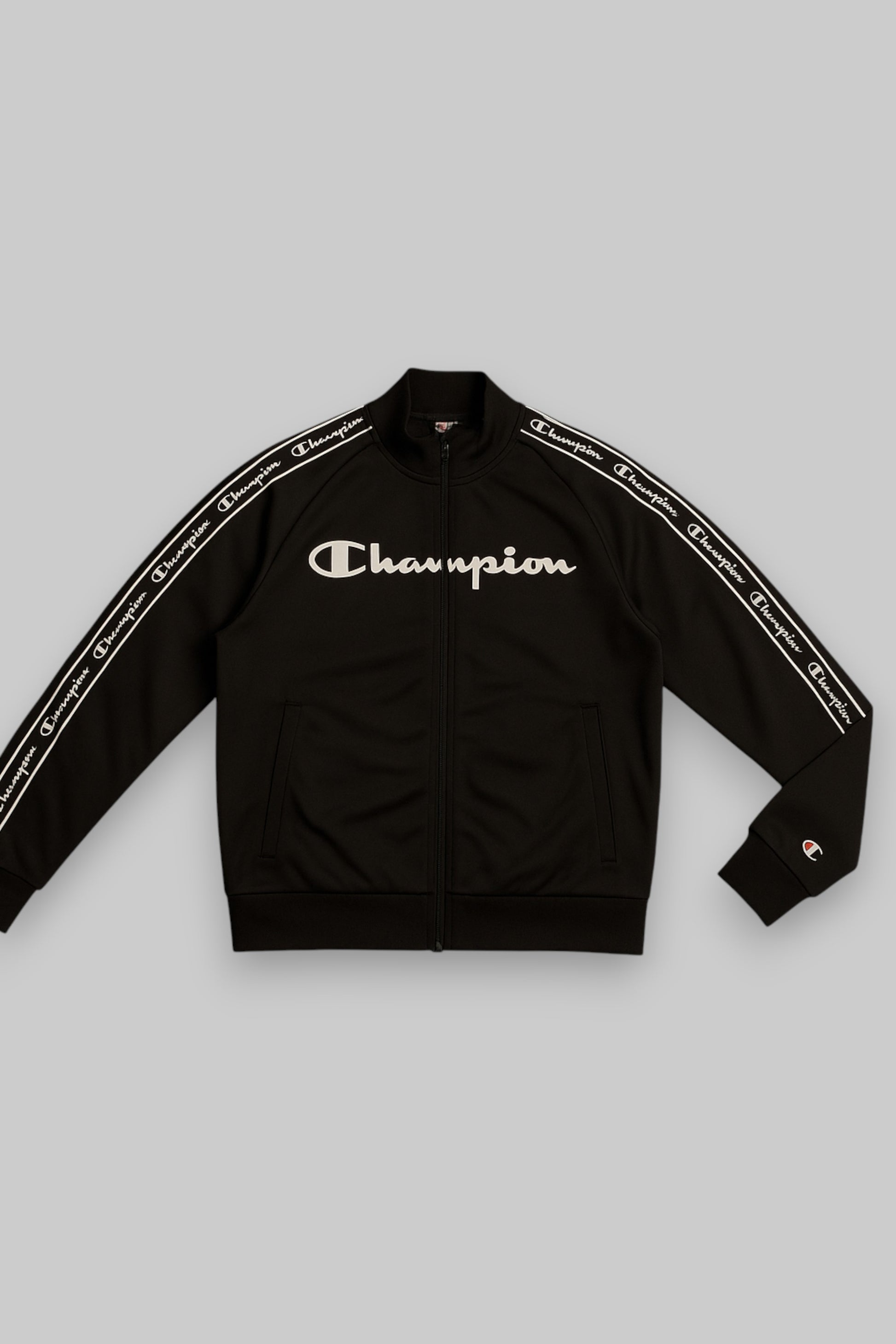 This Champion track jacket is designed for casual wear or light athletic activity, combining comfort with a bold streetwear aesthetic. The jacket comes in black with striking white Champion branding running down the sleeves and across the chest for a standout sporty look. It features a full-zip front*ribbed cuffs and hem, and side welt pockets for added functionality.