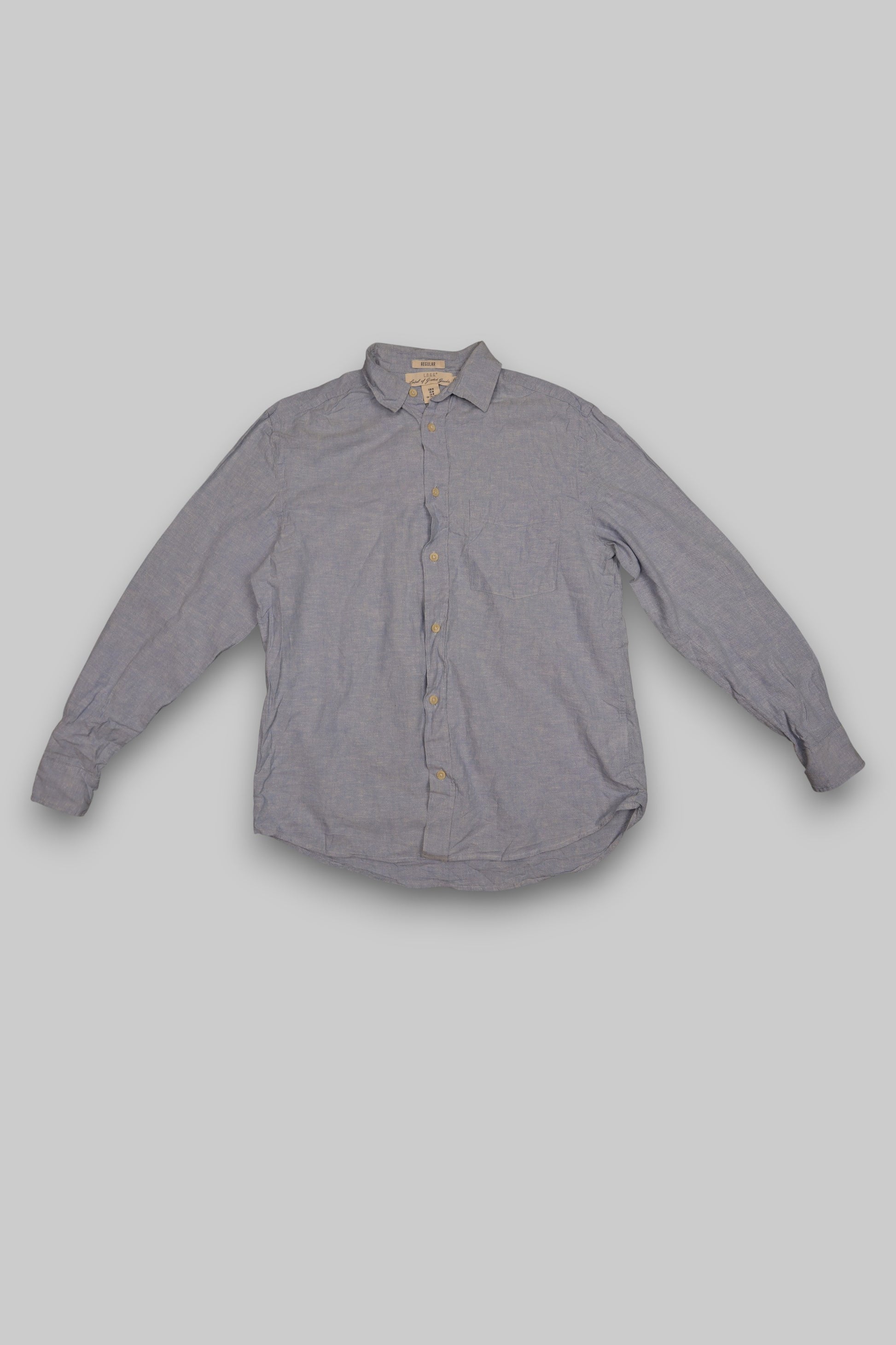 This H&M L.O.G.G. long-sleeve shirt blends casual sophistication with breathable comfort. Made from a cotton-linen blend, it features a light blue chambray texture with subtle white cross-weave detailing for a naturally soft, vintage-inspired look. Perfect for both relaxed and smart-casual occasions.