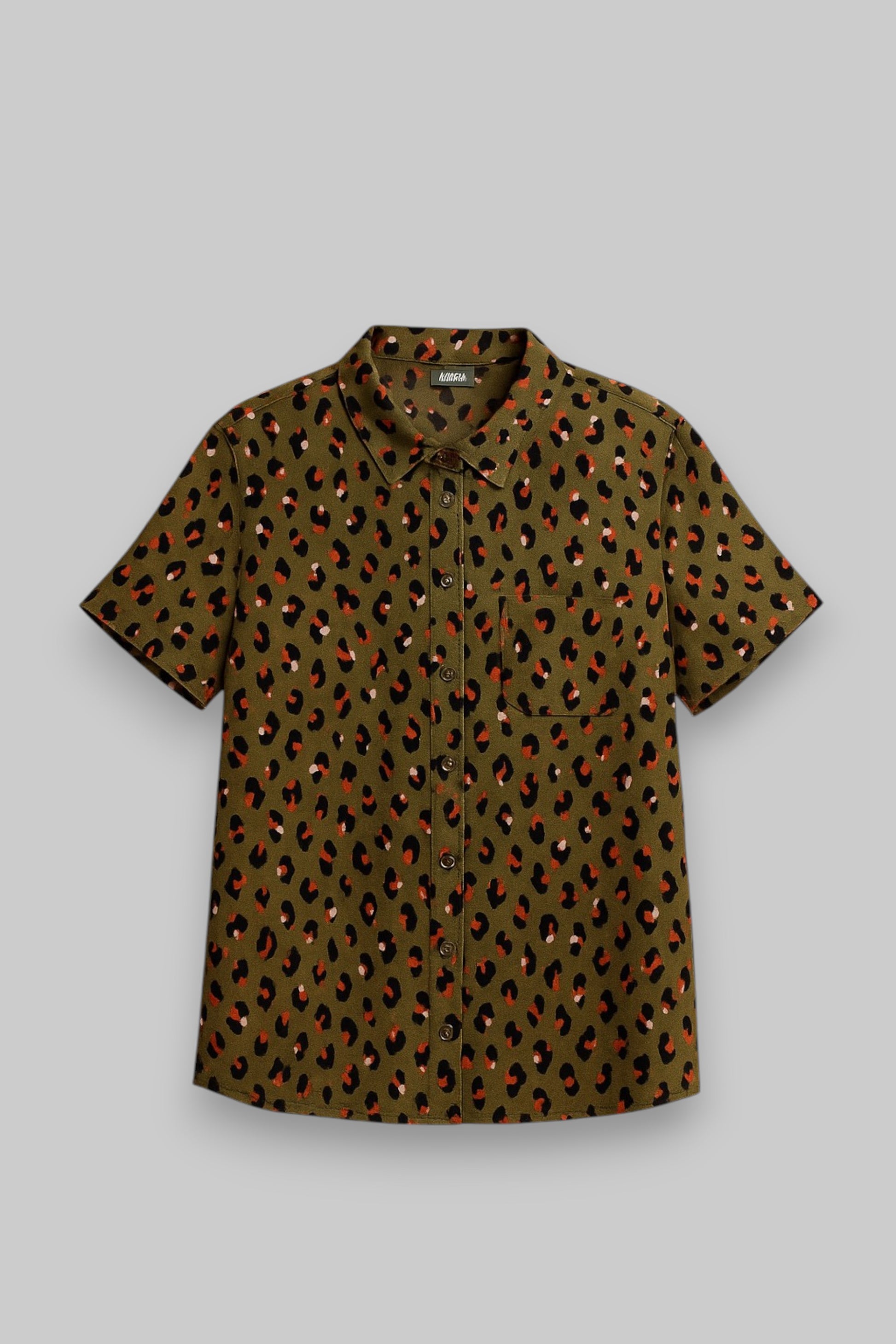 This short-sleeved button-up shirt by HEMA features a bold and modern leopard print in black, red, white, and pink over an olive green base. Crafted from 100% viscose, the shirt offers a soft, breathable drape with a slightly textured finish, making it perfect for casual or statement styling.
