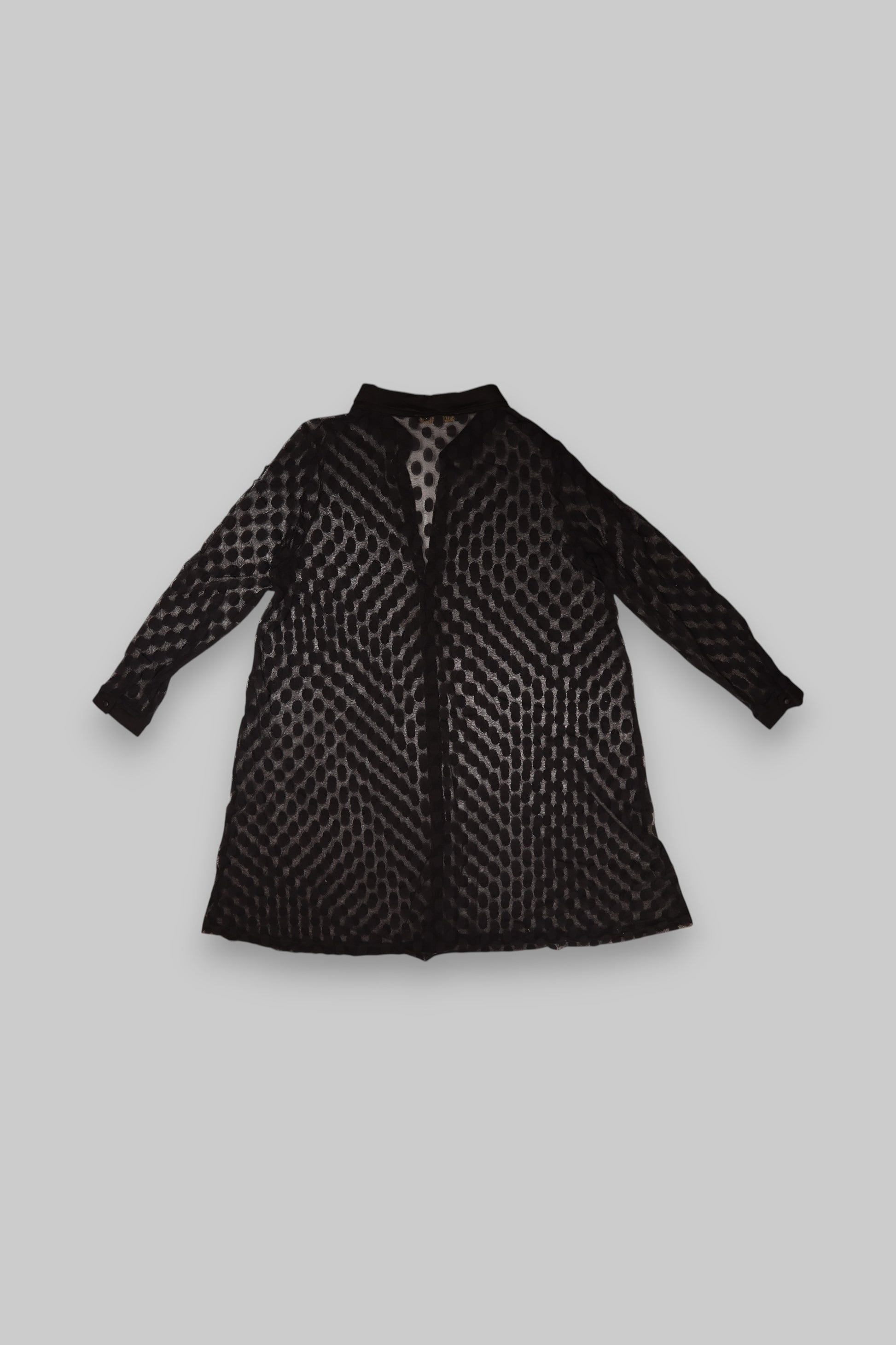 JUNGHWAN JANSEN Sheer Black Mesh Cardigan with Oval Polka Dot Design