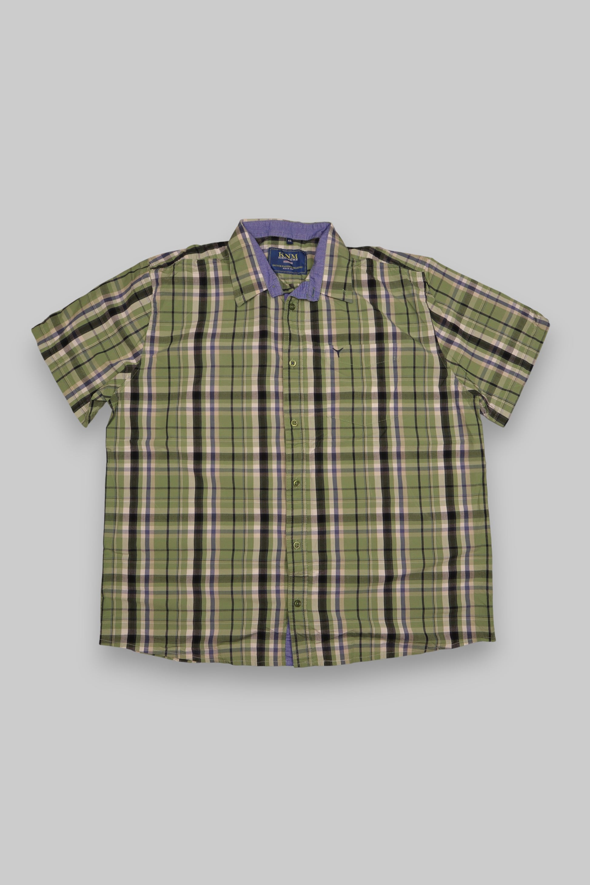 This KNM Kenmore short-sleeve button-up shirt from the Dutch Fashion Makers – Since 1967 collection combines smart tailoring with casual comfort. Designed in a green, blue, white, and black plaid pattern, it features a contrast blue chambray inner collar and placket that add a refined touch to the look. The embroidered chest logo provides subtle branding, making it perfect for both relaxed and smart-casual occasions.
