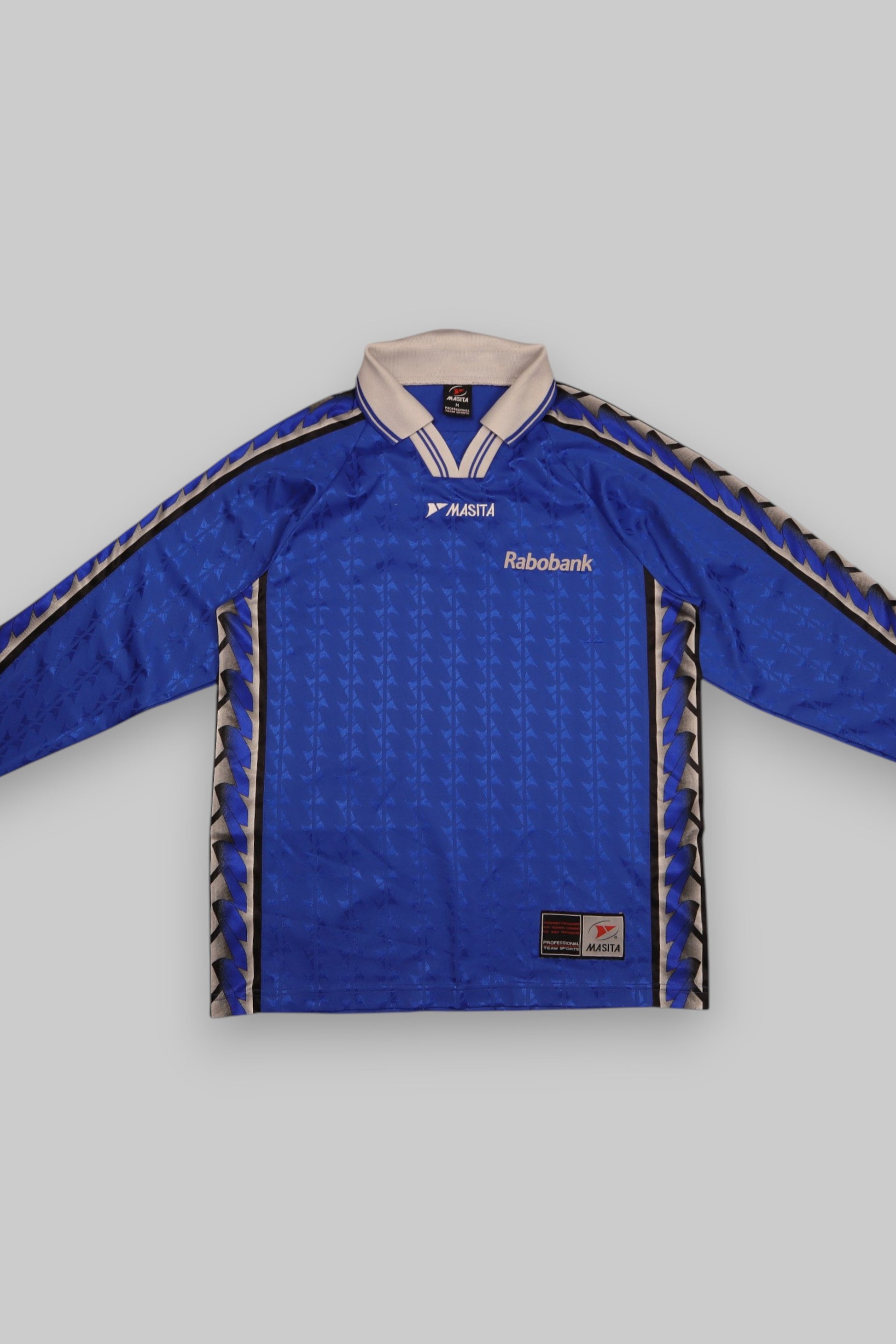 Design Features: Fold-over white collar with blue stripes, ribbed cuffs, arrowhead shoulder and side stripes, subtle geometric woven pattern, “Rabobank” sponsor text, “Masita” logos on chest and hem