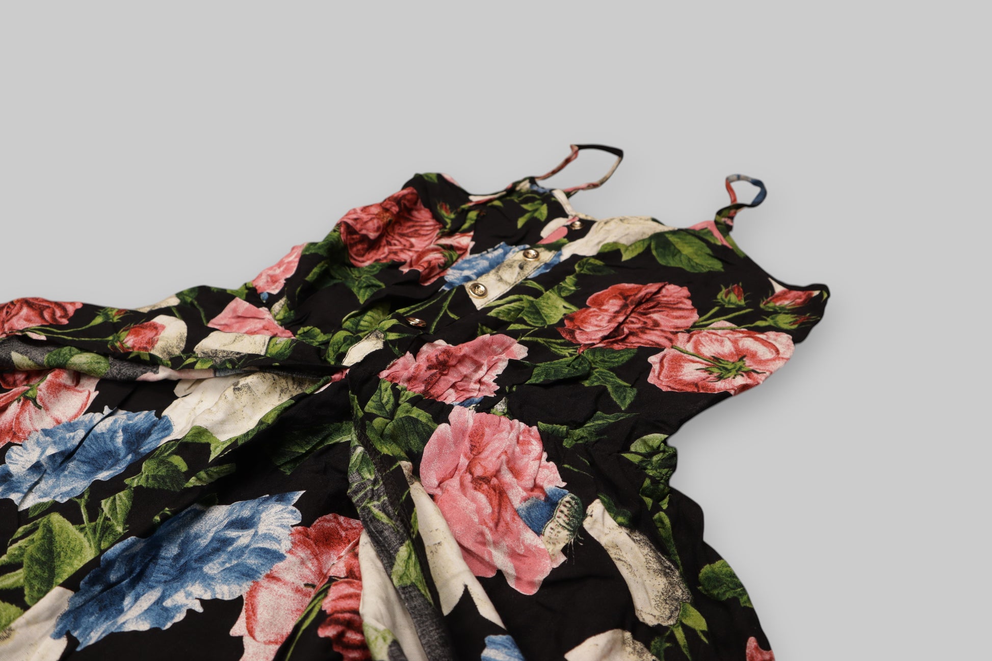 Color/Print: Black base with multicolor floral print — pink, red, blue, ivory flowers and green leaves