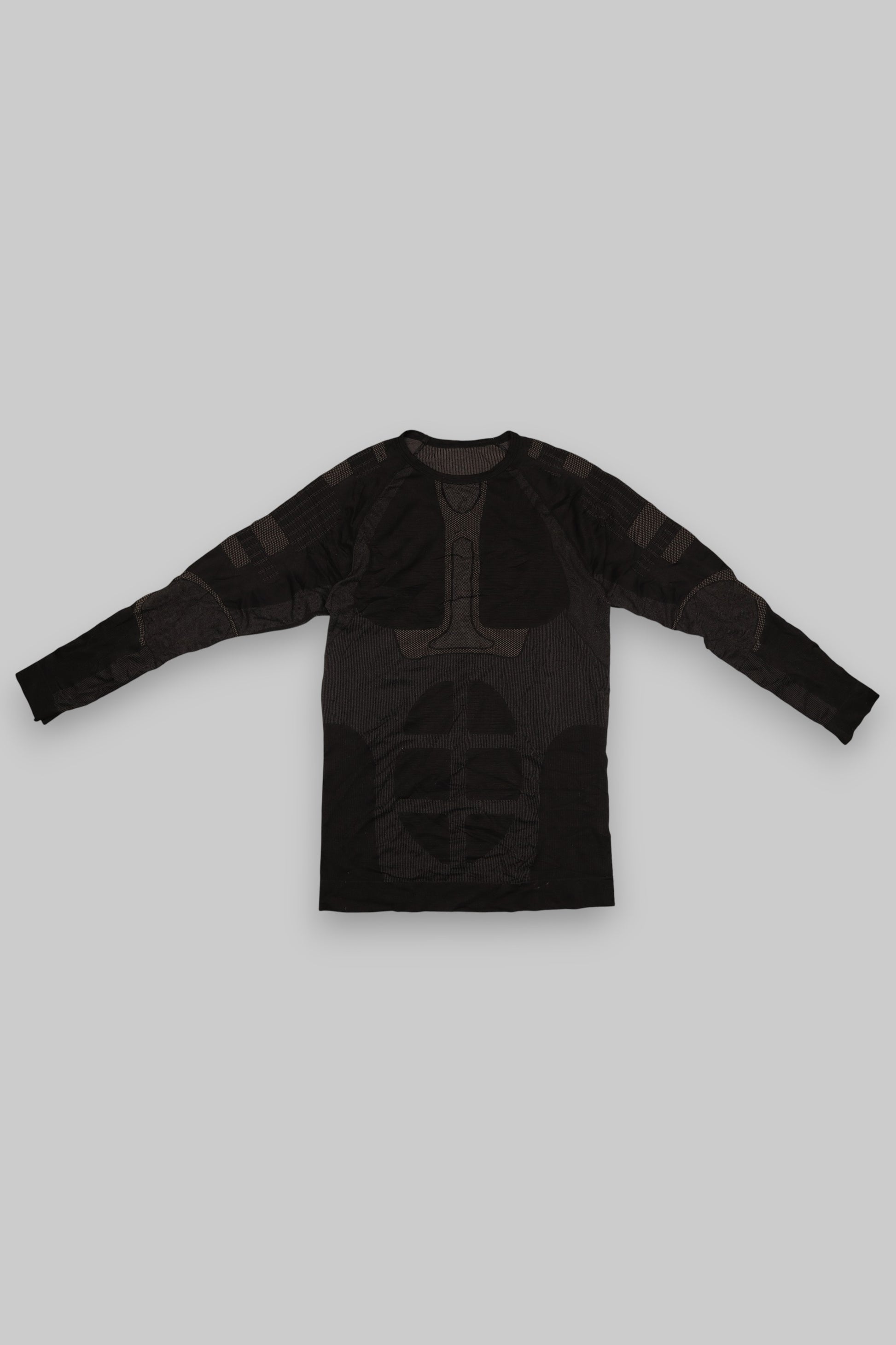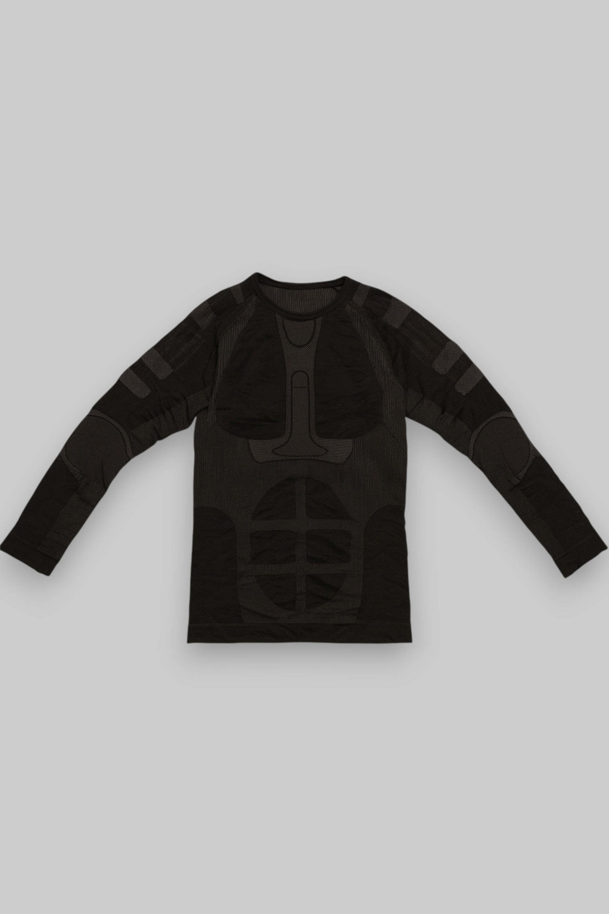 This men’s compression long-sleeve top is built for performance, combining seamless construction with targeted compression zones to enhance comfort and mobility. The matte black base is accented with dark grey contour paneling that highlights a sculpted, muscular texture — ideal for workouts or as a technical base layer.