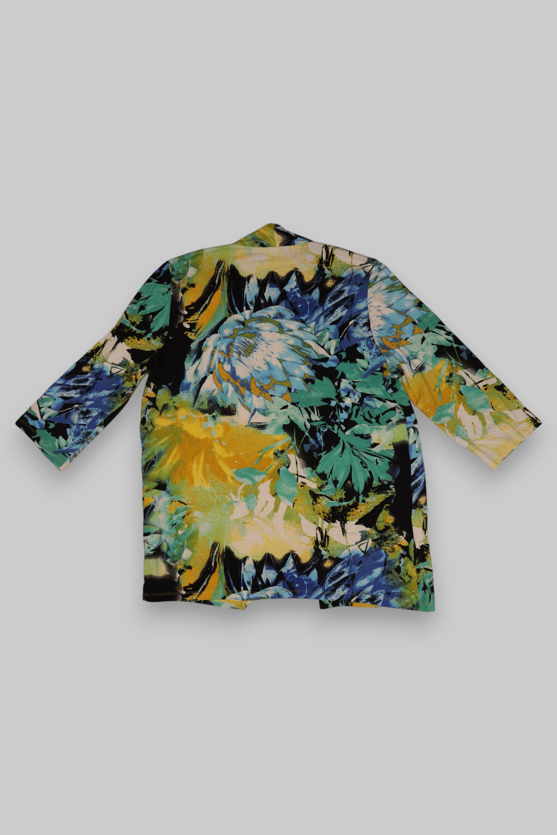 Elevate your wardrobe with this lightweight kimono jacket featuring a vibrant abstract floral pattern in yellow, turquoise, aqua green, blue, black, and white. Crafted from a soft, breathable blend of 95% viscose and 5% elastane, it offers gentle stretch and a comfortable drape perfect for layering over dresses, tops, or camisoles.