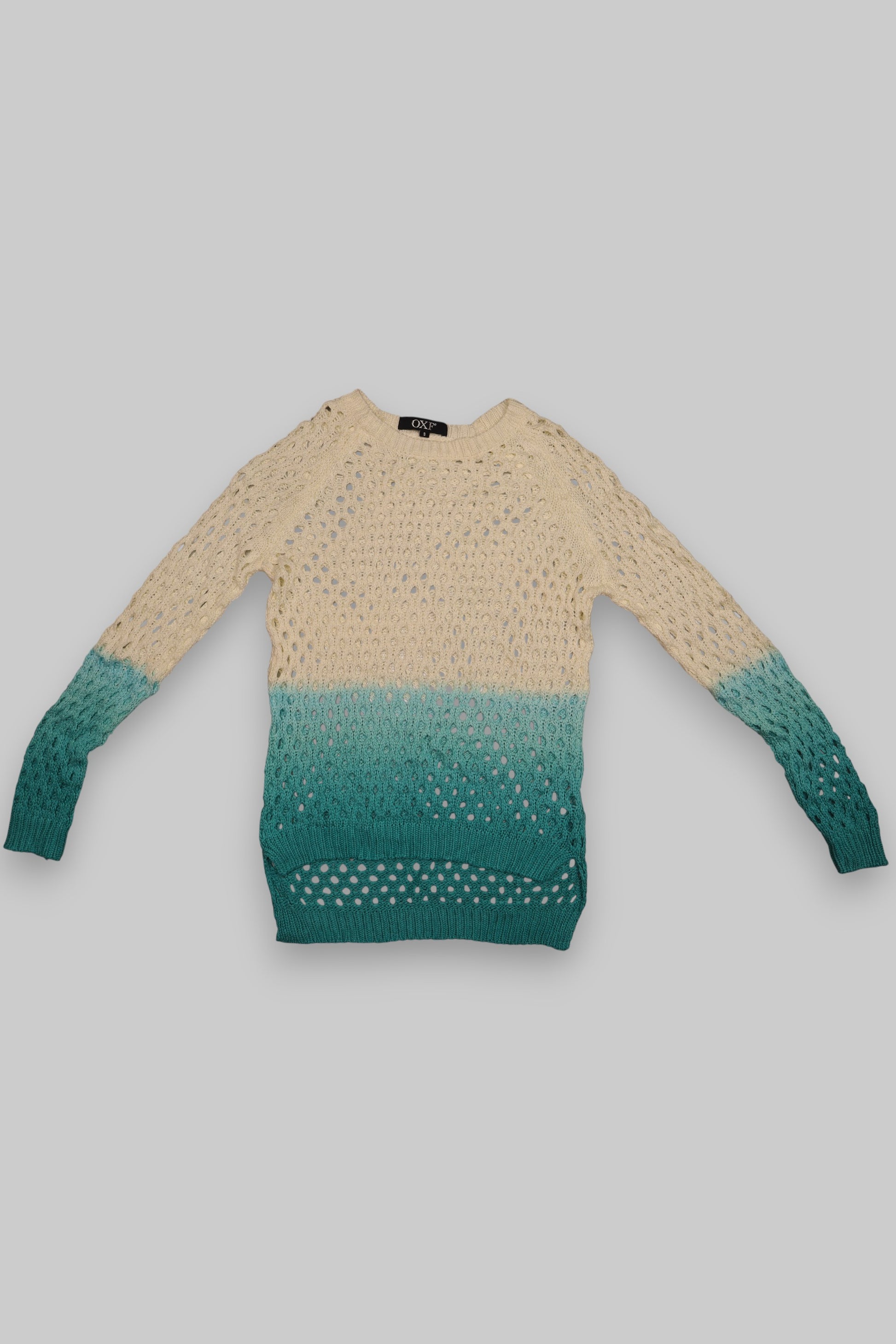 Lightweight open-knit long-sleeve sweater featuring a soft ombré gradient that transitions from cream on the upper body and sleeves to aqua turquoise on the lower half. Designed with a breathable honeycomb-style knit and a fitted silhouette with natural drape.