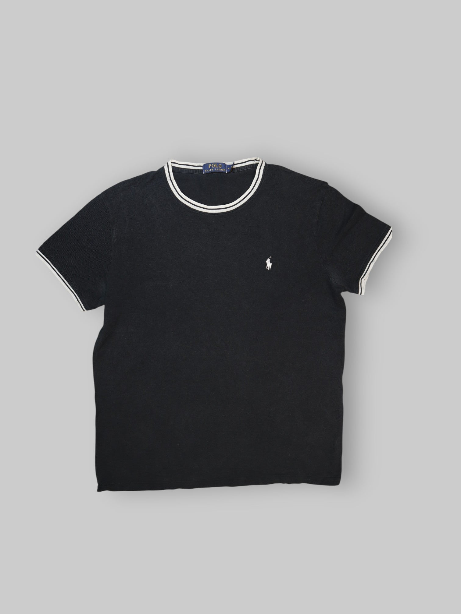 This timeless Polo Ralph Lauren crewneck T-shirt in deep black combines clean minimalism with signature heritage style. Accented with contrasting white ribbed stripes at the collar and sleeve cuffs, it features the iconic white embroidered Polo player logo at the left chest. Constructed from soft cotton for breathable comfort, this piece is perfect for elevated everyday wear.