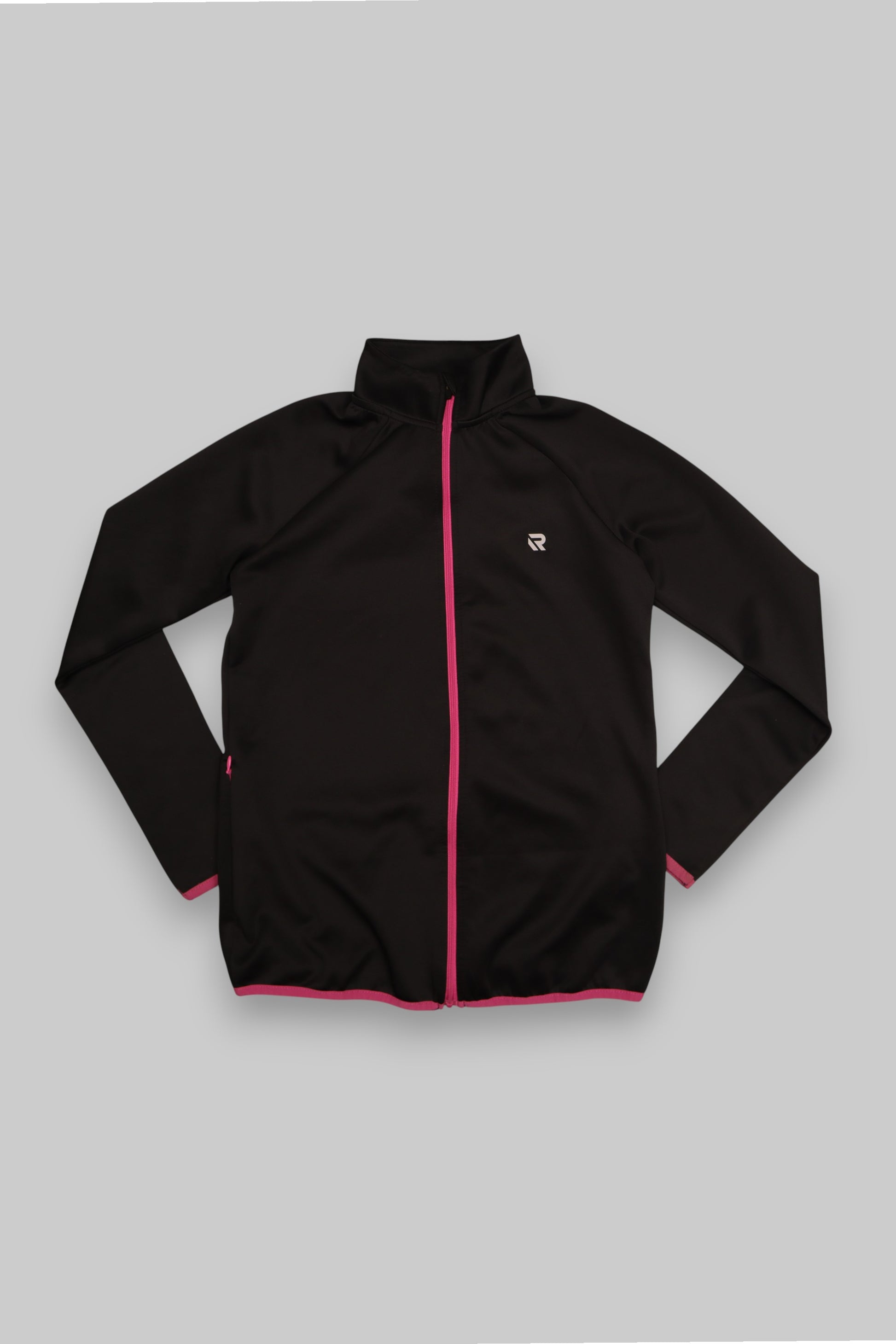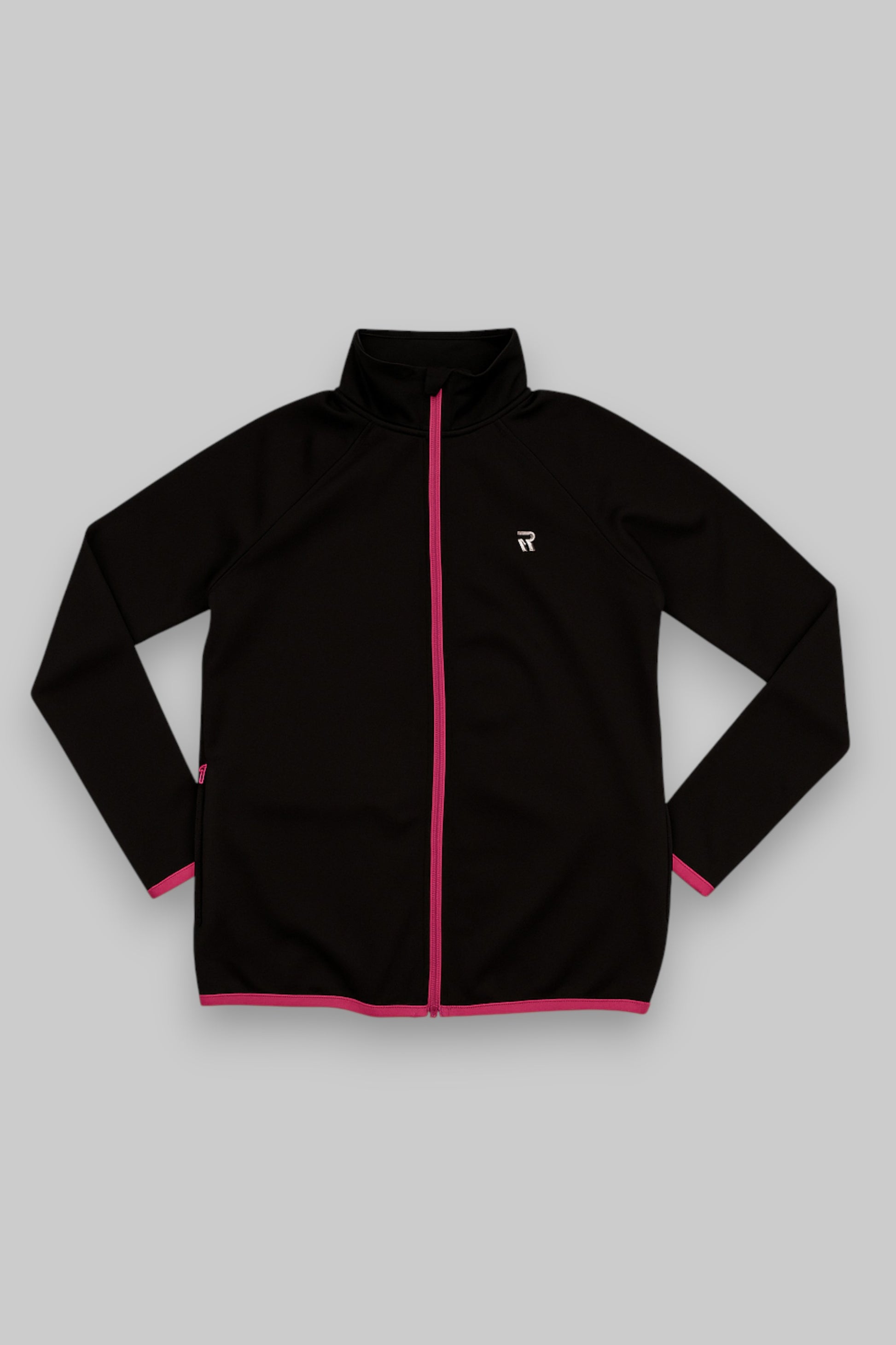 This Redmax full-zip activewear jacket blends sleek performance design with everyday versatility. Crafted from a polyester-elastane blend (90%/10%), it offers a fitted silhouette with subtle stretch for comfort and mobility. The jacket is finished in black with bright magenta trim accents, including a full-length magenta zipper, contrast edging at the cuffs and hem, and a high collar for added wind protection. A minimalist “R” logo on the chest provides a clean branded touch.