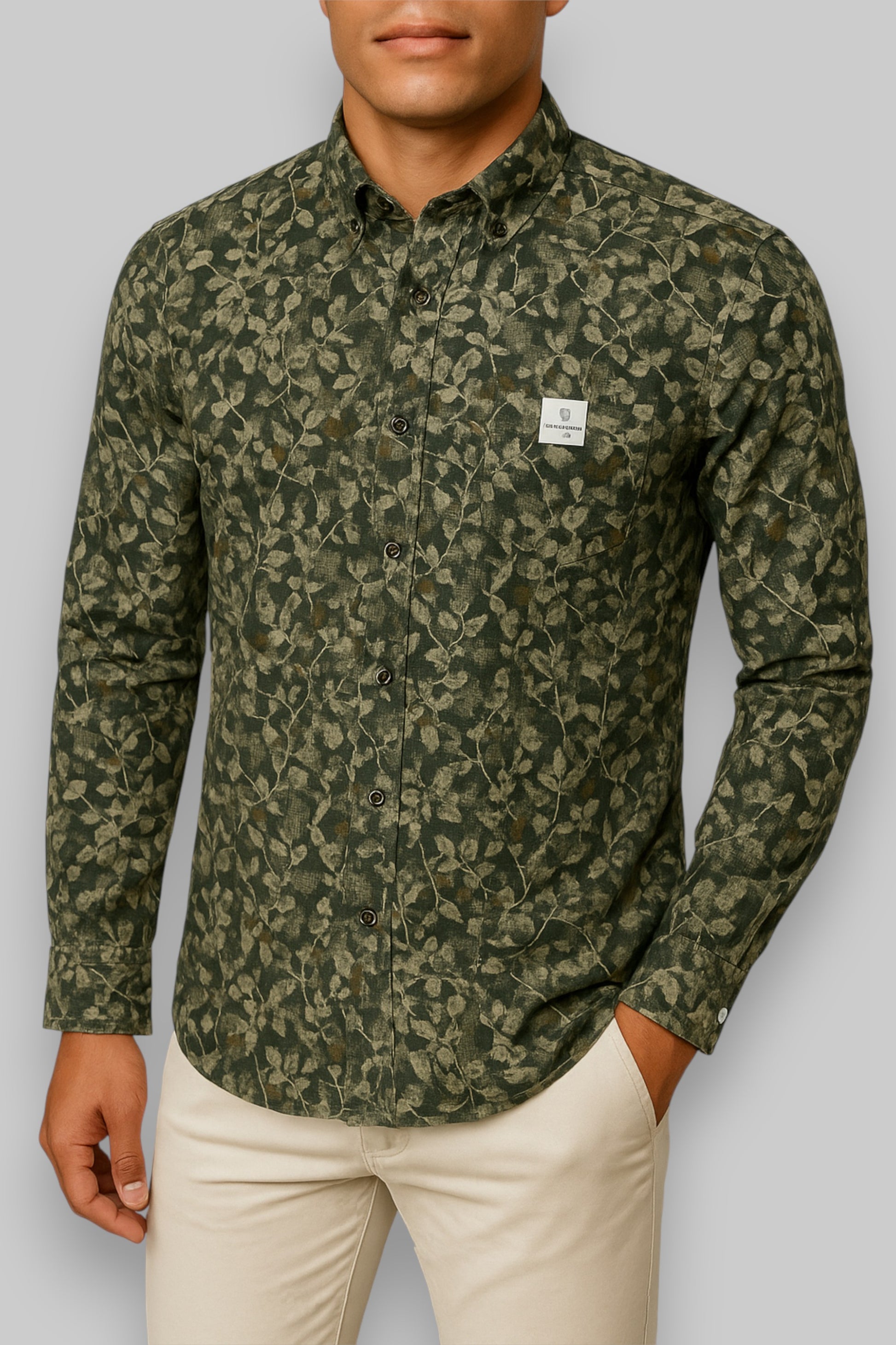 State of Art Men’s Long-Sleeve Printed Shirt – Forest Green Abstract Leaf Pattern