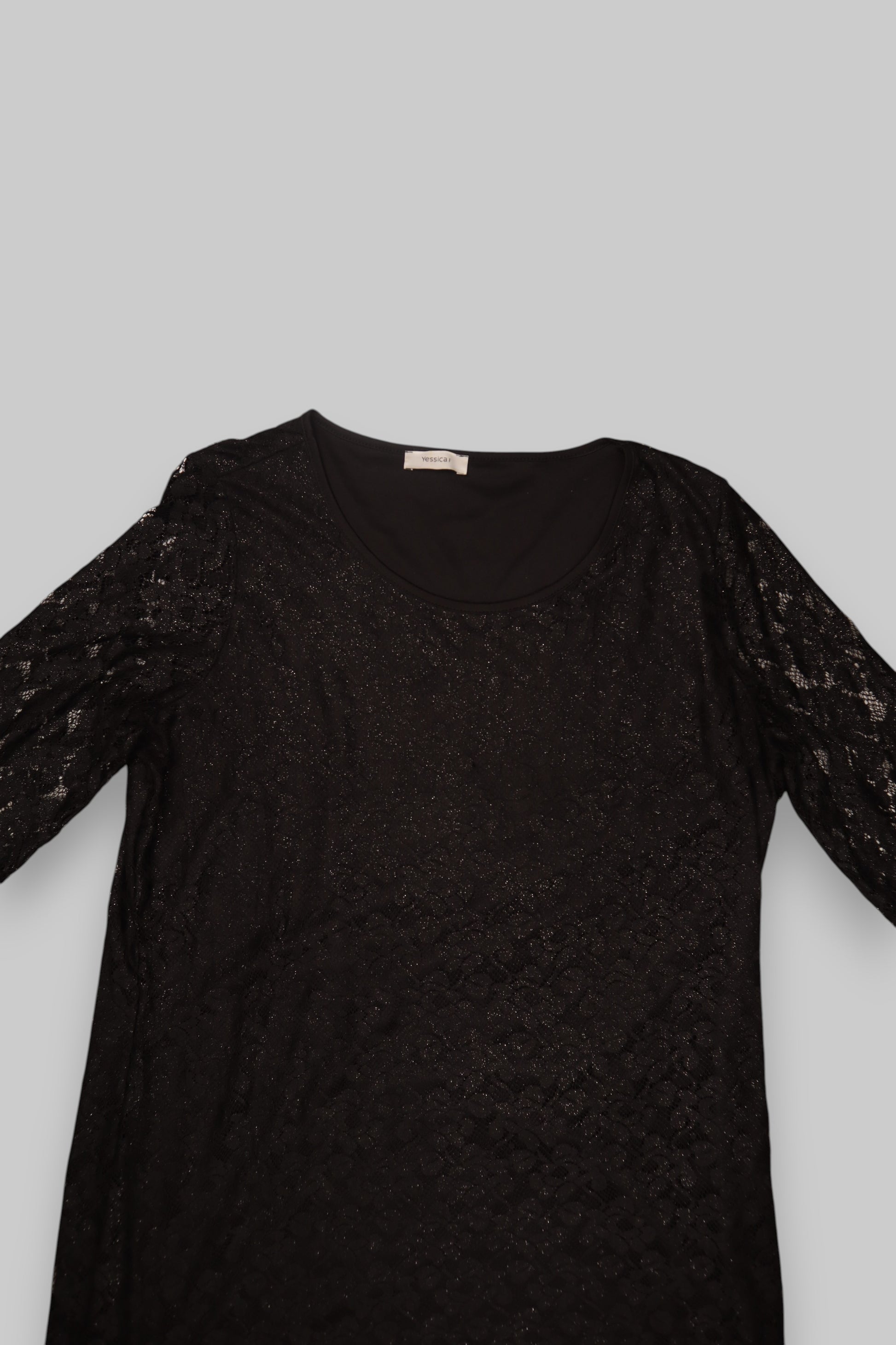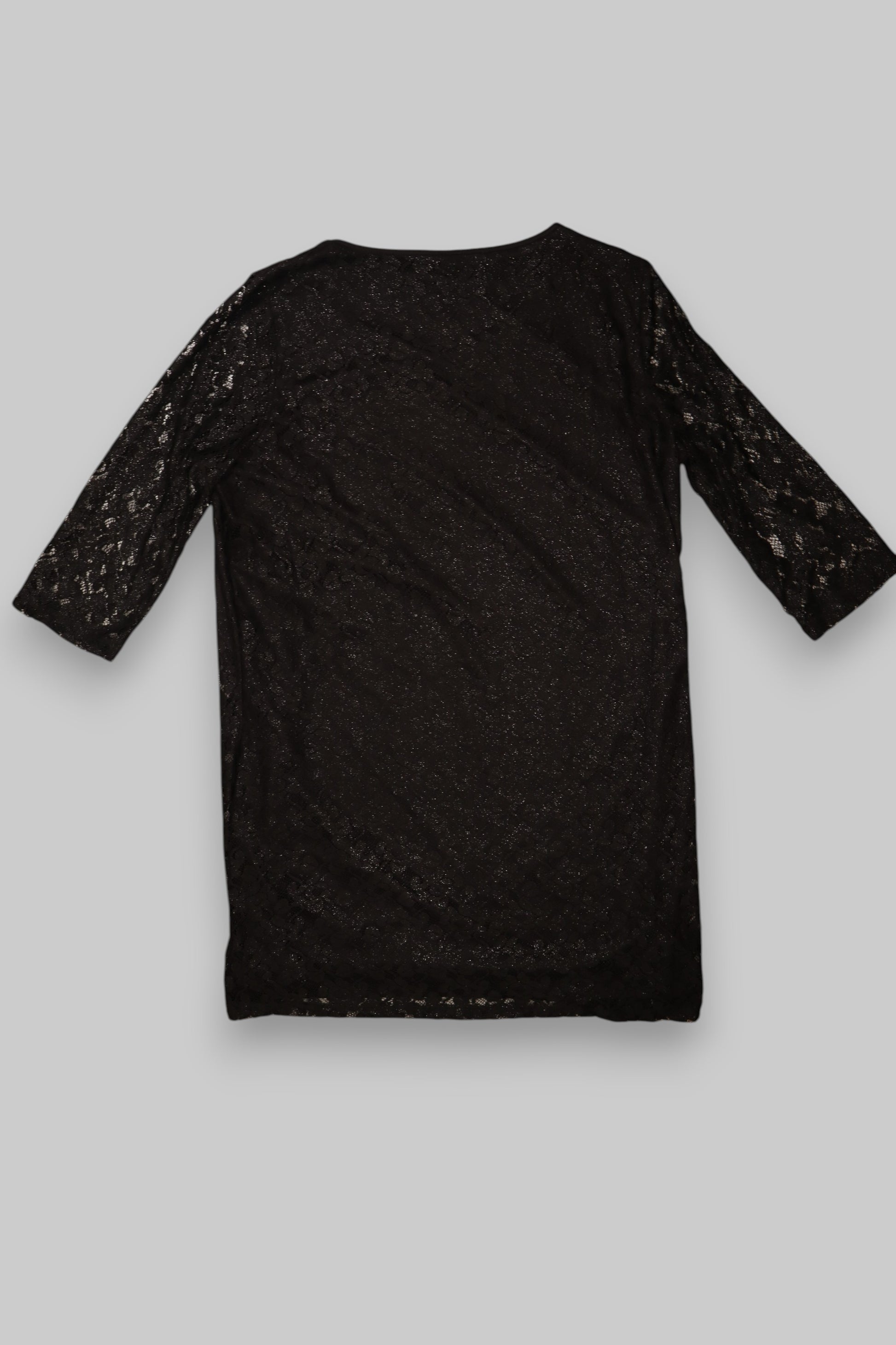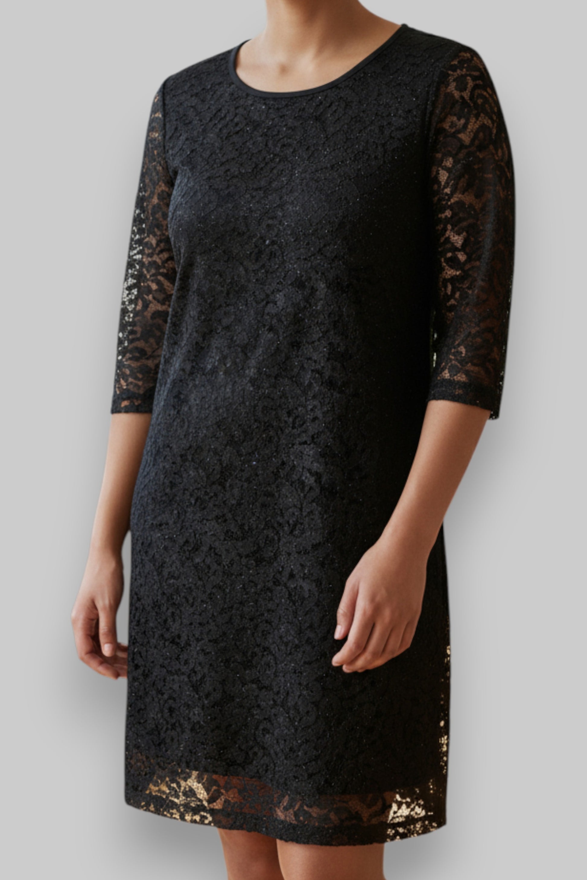 Yessica Black Lace Tunic Dress – 3/4 Sleeves, Shimmer Detail, Classic Scoop Neck