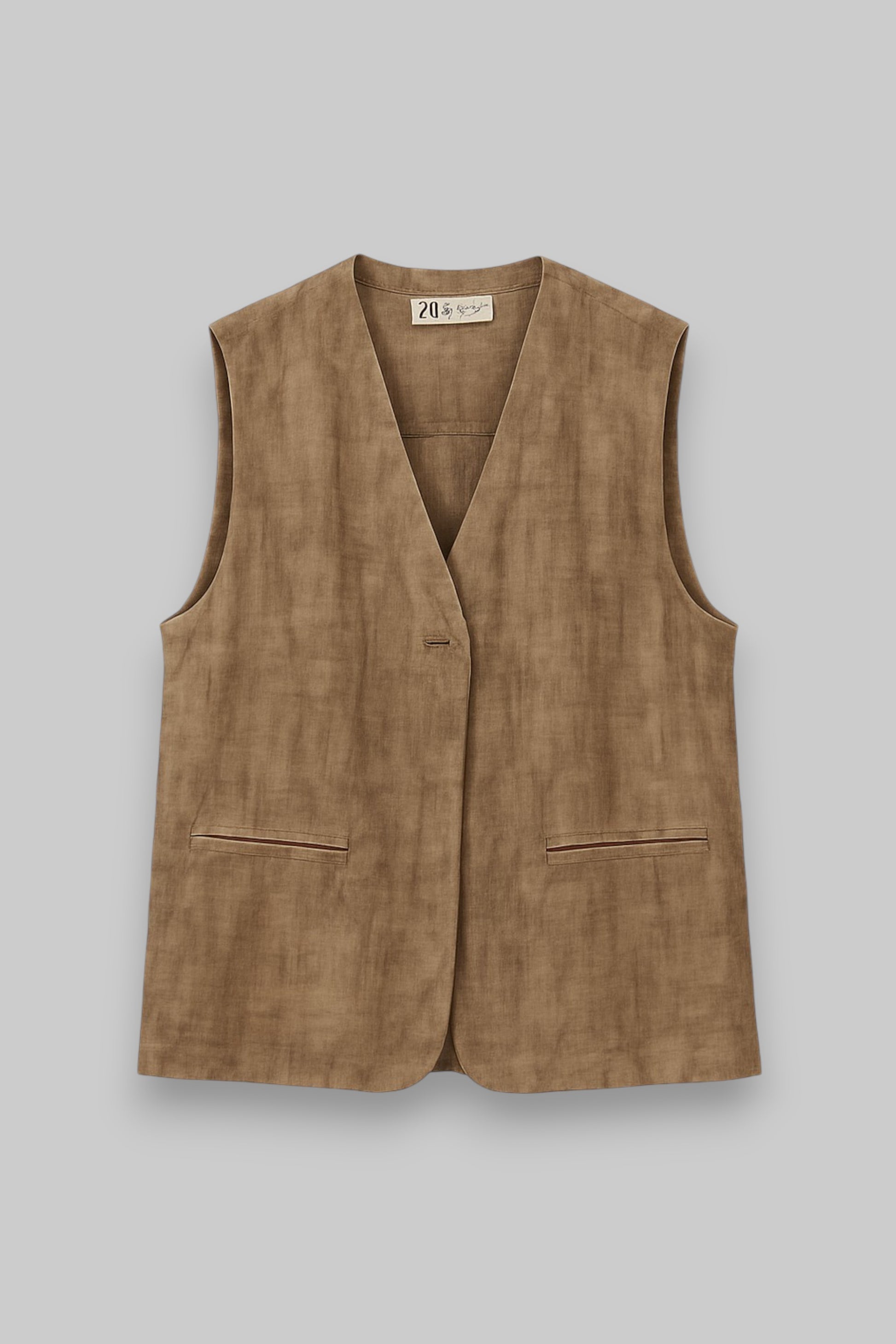 This sleeveless vest from Zara Man is crafted from 100% linen for a lightweight and breathable fit, perfect for warm-weather layering. The earthy distressed taupe brown tone gives it a natural, textured look with a relaxed, minimalist silhouette.