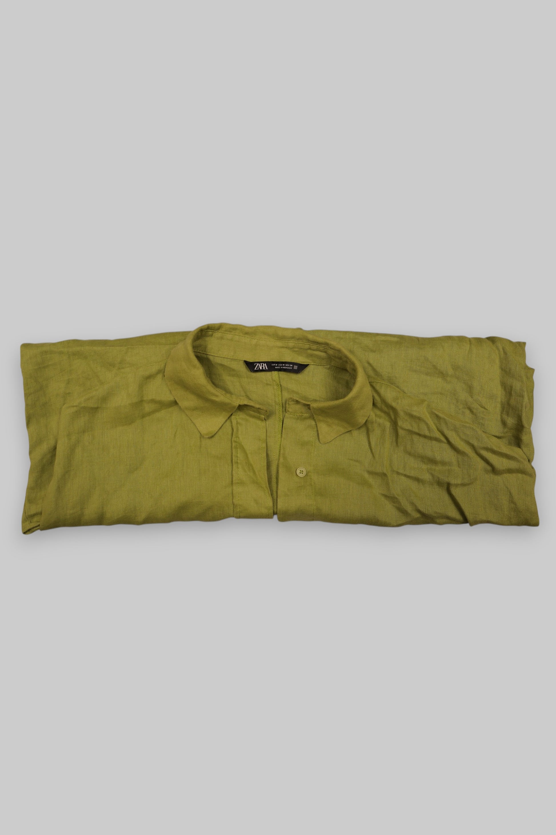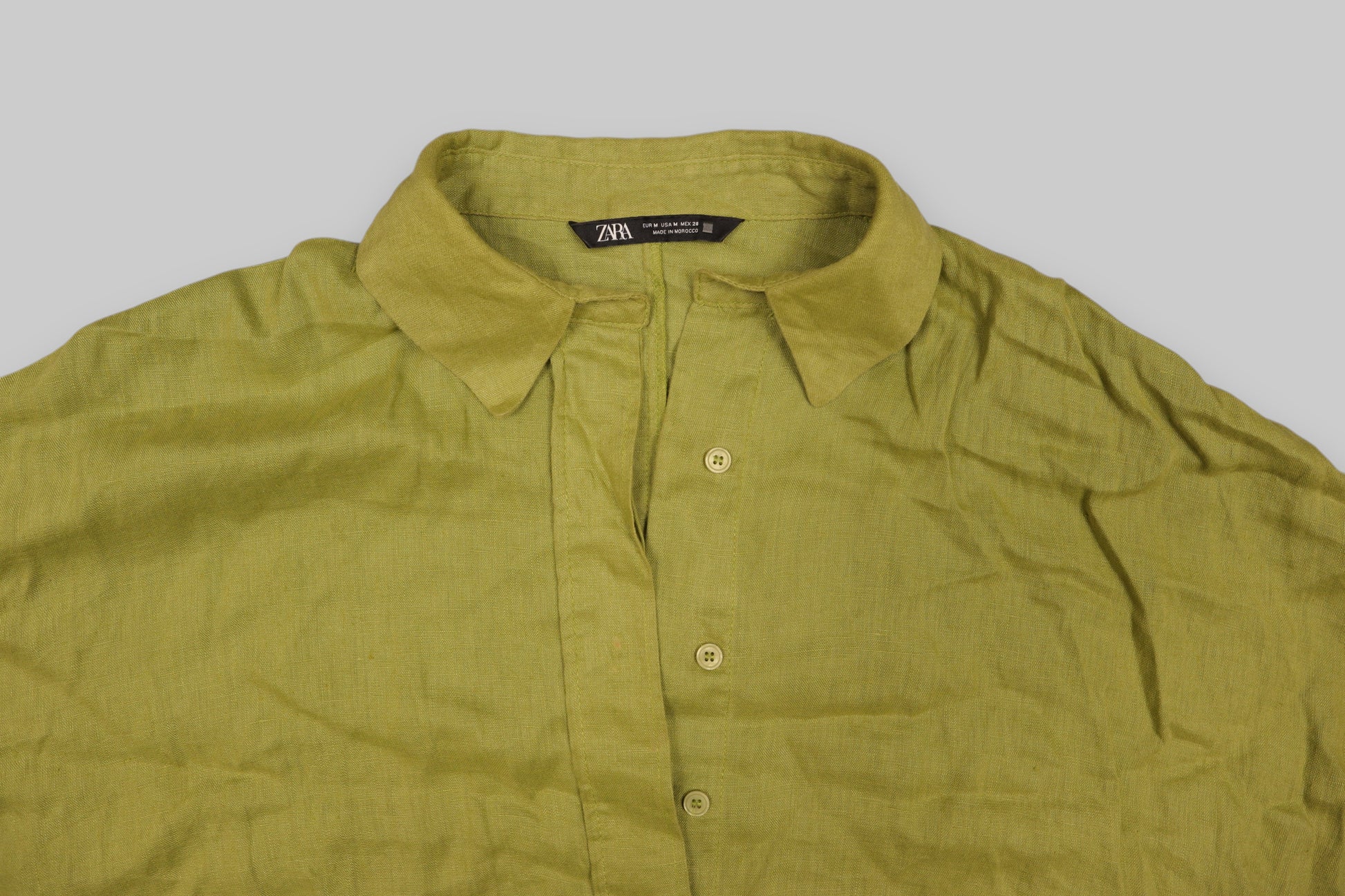 ZARA Olive Green Linen Short-Sleeve Relaxed-Fit Button-Down Shirt – Size M